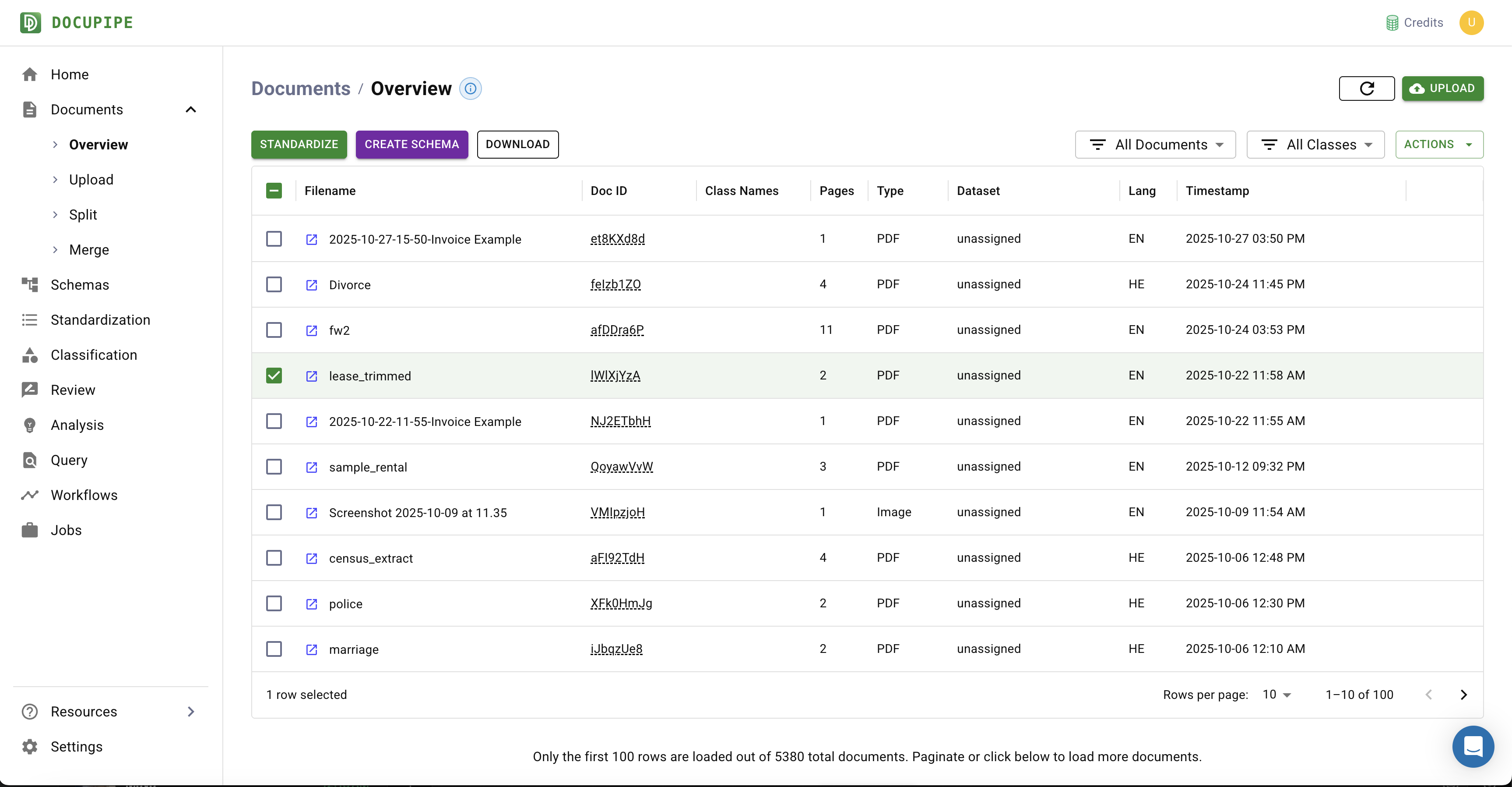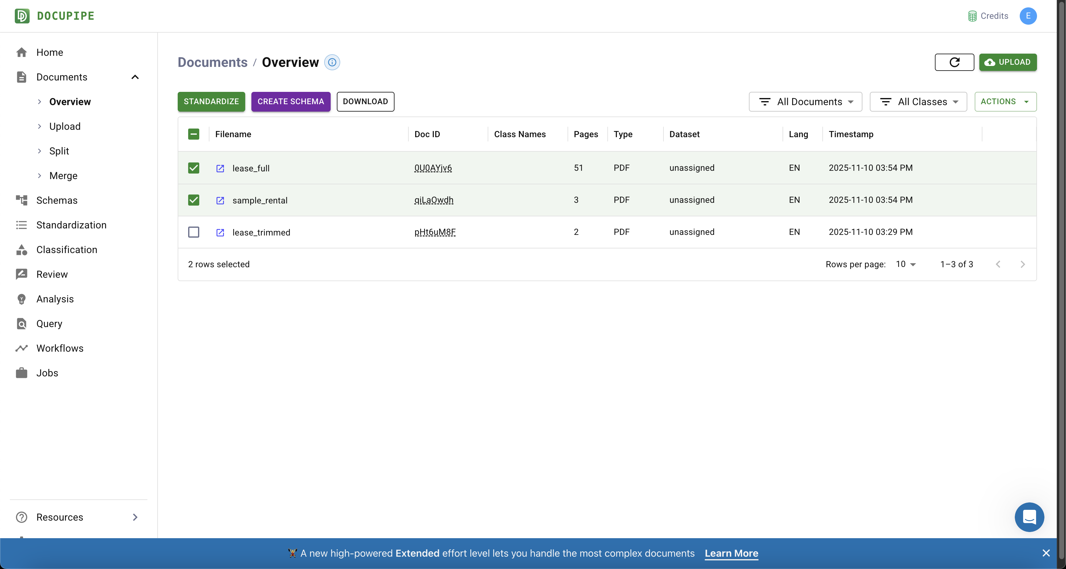 All you need to do to standardize the documents is upload more documents, select the documents, and hit the green standardize button.