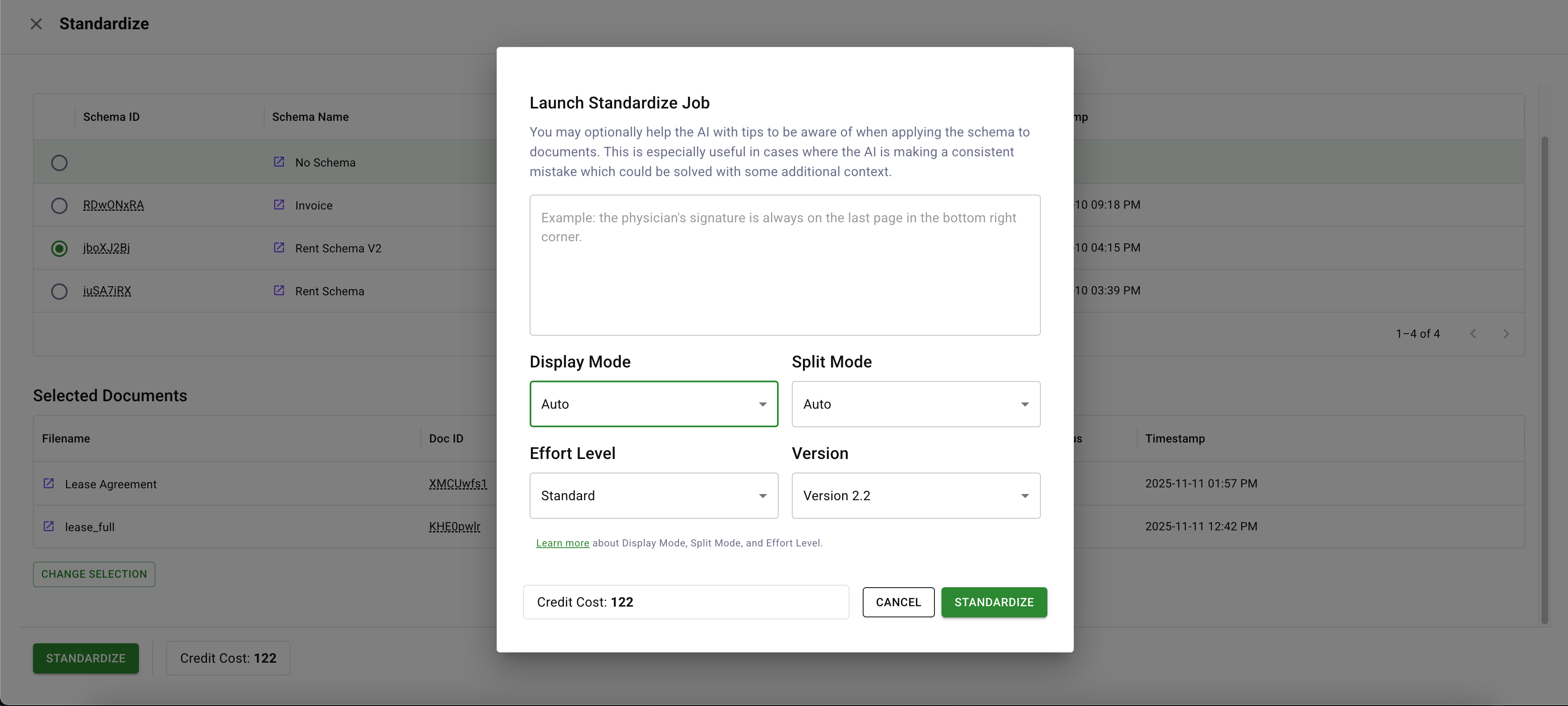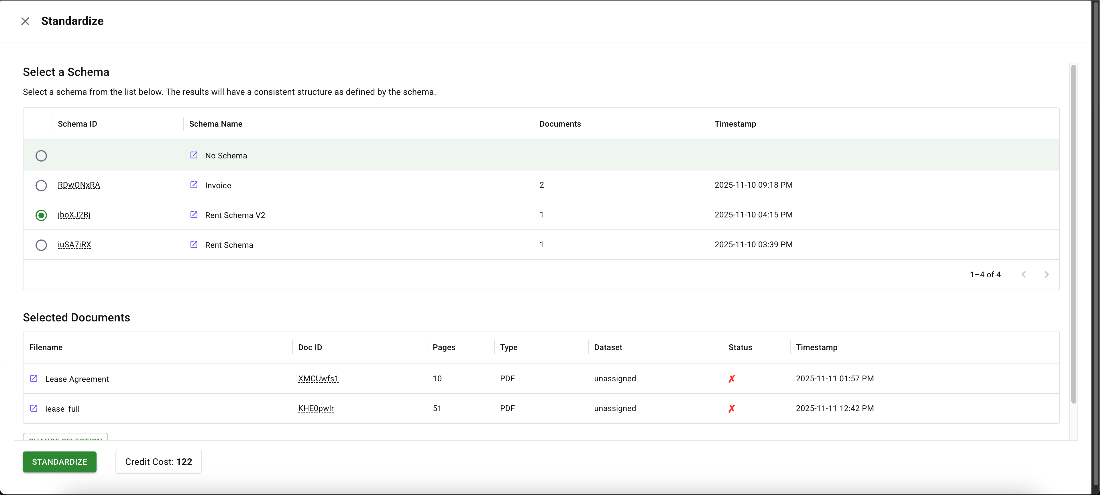 When you hit Standardize, you will be prompted to pick what schema you want to run on your selected documents.