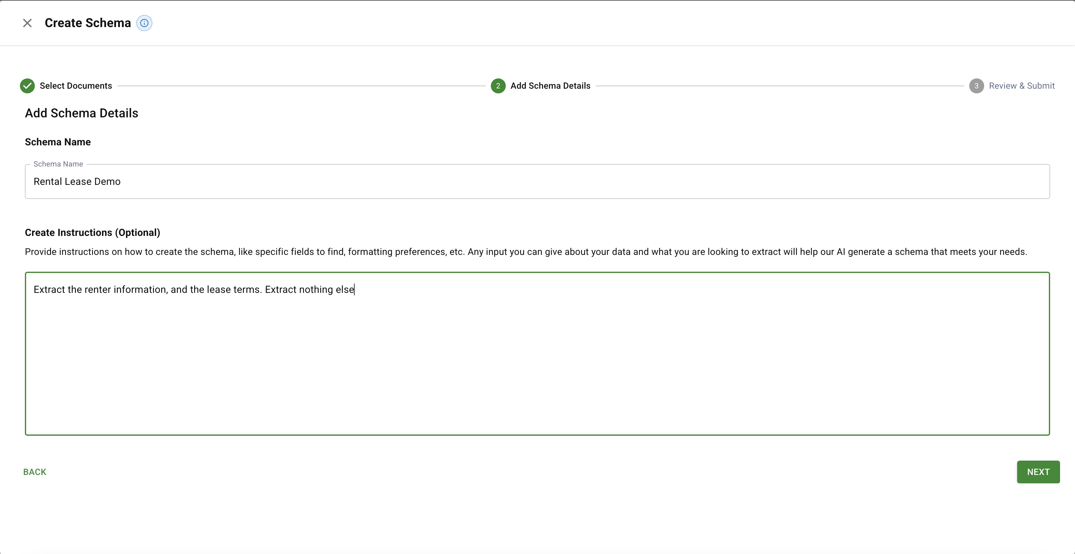 Hit "Create Schema" (the purple button), and type in some instructions for how you want to understand rental leases.