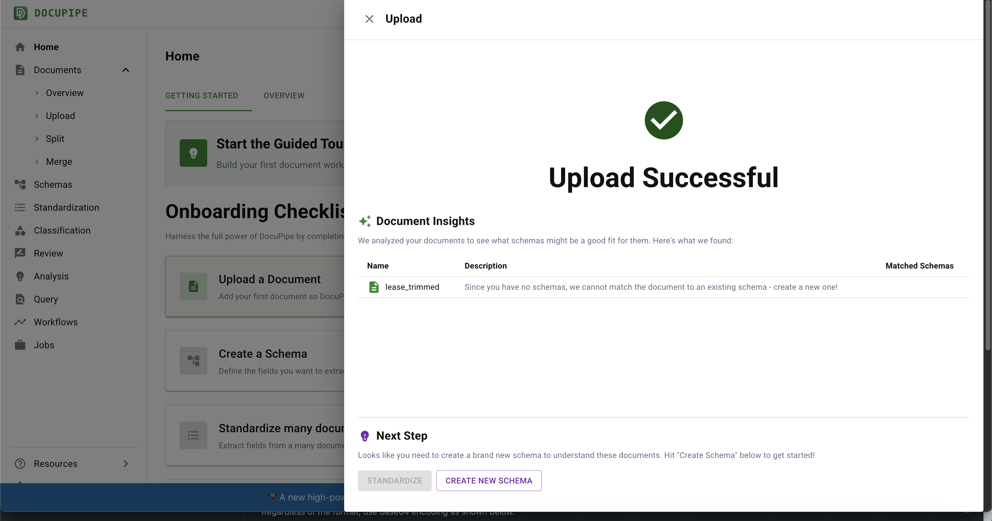 Building a schema is the heart of DocuPipe. You typically select 1-20 documents of a certain type, and describe in plain language what you want to extract from this kind of document.