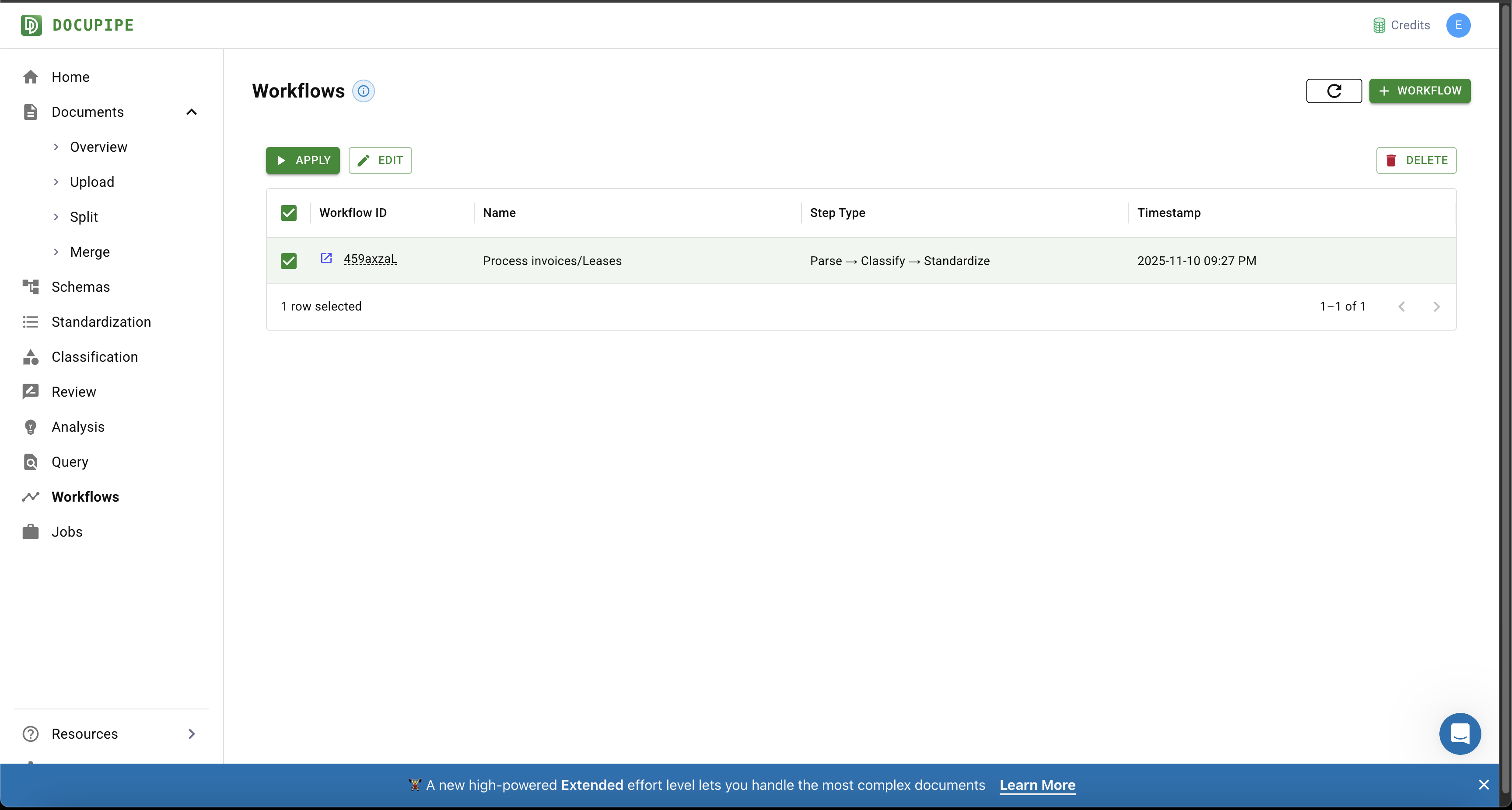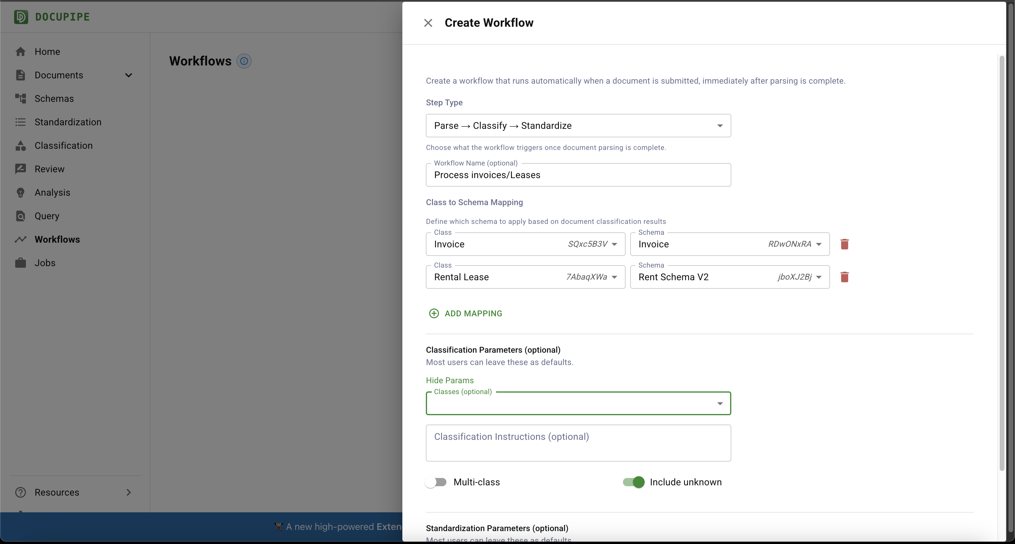 DocuPipe workflows let you string together common automation steps. For example, you might upload a document, classify it into one of a few predefined types, and then standardize it with the schema that matches the chosen class.