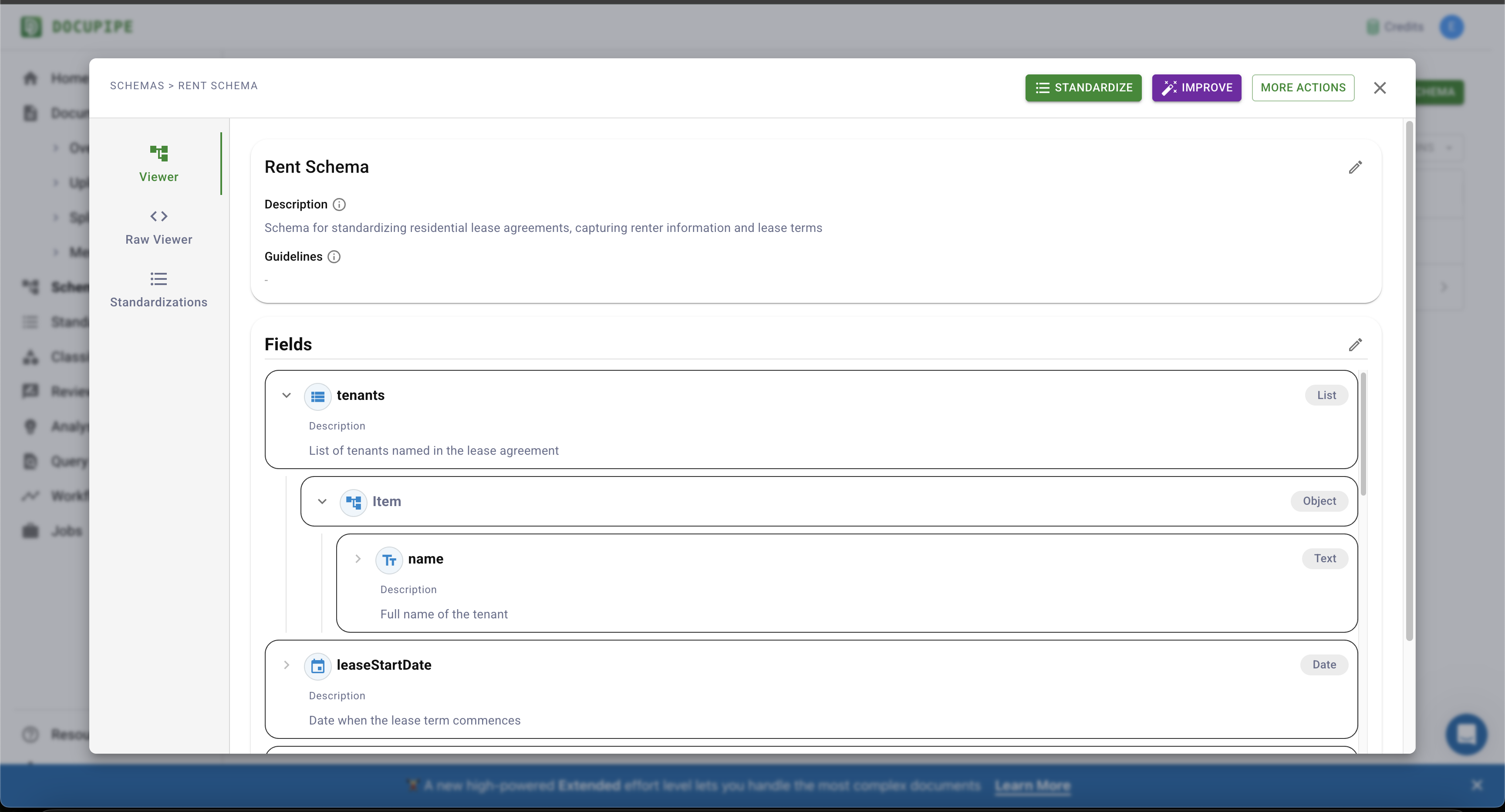 To make standardization useful, define a consistent structure and clarify how you want DocuPipe to interpret each document type. We call this set of definitions a schema. Think of a schema as a collection of slots for information you expect to find (e.g., a rental lease might need monthly amount and lease end date values).
